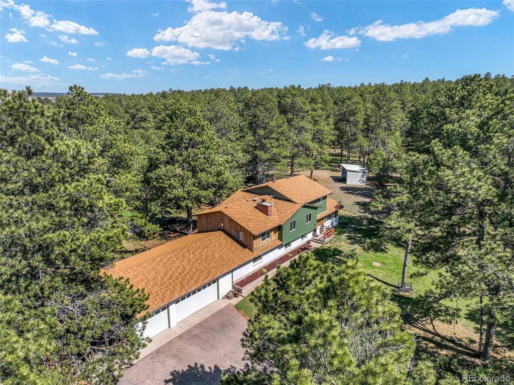 Welcome to this charming countryside retreat nestled on 5 peaceful, treed acres of serene equestrian landscape in El Paso County. This versatile and beautifully updated property offers the perfect blend of rural charm and modern convenience. Located just off Hodgen and Meridian in District 40, this 5 bedroom, 4 bathroom home features space to spread out, both inside and out. The barn/workshop includes electricity and two run-in shelters, while the acreage has two fenced pastures with no-climb fencing, ideal for horses or hobby farming. The home itself has been thoughtfully updated with new paint, doors, hardware, blinds, LED lighting, and smart home features including a Nest smoke detector, Ecobee thermostat, some smart switches, Ring camera, and Quickset smart lock. The main level includes a spacious kitchen, dining area, formal dining or sitting room, and a sunroom that opens to the back deck and yard—complete with a greenhouse. Downstairs, you’ll find a large laundry room, living room with engineered hardwood floors and a cozy wood-burning fireplace, a junior suite with its own ¾ bath, and an expansive, versatile rec room with garage access. Upstairs, two secondary bedrooms share a full hall bath, while the fully renovated primary suite is a true retreat, massive in size and outfitted with dual walk-in closets, a framed hidden closet, and a luxury bath featuring a step in shower, heated towel racks, and dual sinks. The uppermost level offers a fifth bedroom and another full bath. Additional perks include a 3-car attached garage with direct backyard access, a 2018 roof and well pump, and completed fire mitigation for peace of mind. A rare find offering privacy, flexibility, and modern comfort all on your own slice of Colorado paradise.