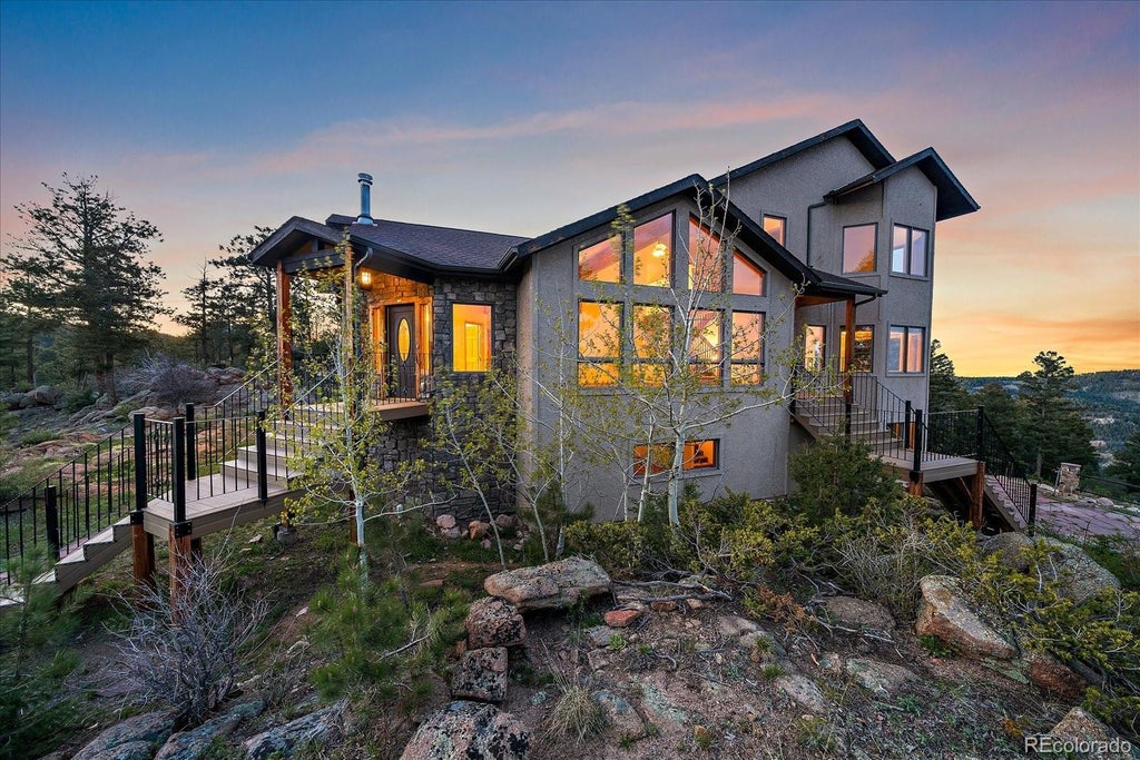 Far reaching, majestic views at every degree! Nestled in stunning landscapes, this exquisite residence offers an unparalleled living experience. A custom-built modern home featuring five spacious bedrooms and four elegantly designed bathrooms, ensuring ample space for relaxation and privacy. Each room boasts sweeping views from snow-capped Pikes Peak to Cathedral Spires featuring brilliant sunrises and sunsets, creating a connection with the breathtaking natural surroundings. Bright and open...south facing all day sun. Appointed with hickory wood floors, vaulted ceilings, floor to ceiling windows...greeting you upon entering. An office or den with peaceful views can make your day joyous. It's stunning...scanning the landscape from the Primary Suite! On the lower walk-out level, a family room with wood stove will make a chilly night seem cozy. Spacious living areas on this level offer flexibility...whether game rooms, gardening room, media room, or a workout room are for you. Situated on an expansive 41 acres, this property backs to Reynolds Park, creating opportunities for outdoor adventures right in your backyard. A highlight of this home is an exceptional flagstone patio complete with a fire pit and outdoor kitchen—ideal for entertaining and savoring Colorado's picturesque weather. Whether you're relaxing and enjoying a quiet evening at home or hosting a gathering, this unique setting is a rare find. Experience the serenity of living amidst nature while enjoying modern amenities and thoughtfully designed spaces.