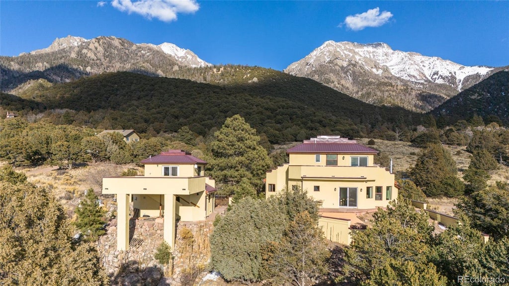 A Crestone Icon, with over 3100 sq feet of living space, this spectacular newly renovated home is situated at the top of Brookview across from the National Forest, ensuring a perfect view of the mountains. Recent renovations/upgrades over the last few years include the metal roof, interior walls, gutters, exterior stucco, on demand heaters (including a dedicated one for the in-floor radiant heat). Using over 120 loads of fill soil and boulders, the homesite was raised over 8 feet, positioning the ground level above treeline. Walking up to the house, surrounded by stunning buttress structured walls (which were originally to be used as walls for an outdoor greenhouse) the sense of seclusion and grandeur are at every turn. With oversized windows in every direction, and large patios and balconies, the views of the towering Sangre De Cristo Mountains and the San Luis Valley are breathtaking. White, diamond plaster walls glow in the warm natural light provided by the sunshine, with expansive wood beams showcasing the substantial durability of the space. The entrance foyer gives way to a fantastic chef's kitchen, which includes TWO large refrigerators, 6 burners, a double oven, and even a serving window. The living room is positioned around a large wood burning fireplace, perfect to take any residual chill out of the air. The dining room boasts floor to ceiling windows in a panoramic view of the valley, with doors opening to the back patio. Two ample bedrooms downstairs (one with a built in floor standing safe) and a stunning 3/4 bathroom complete the first floor. The second floor stairs were designed for the original owners to walk hand in hand as they ascended the steps, which bring you to a spectacular second floor suite, with awe-inspiring views in all directions, and huge primary bathroom and walk in closet. The detached guest house includes two bedrooms and a full bath..Check out the three matter port videos for a complete view of this one-of-a-kind house.