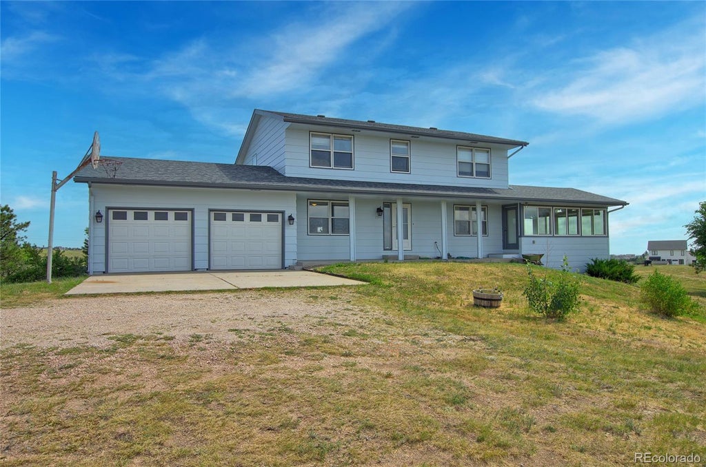 Come enjoy the best of both worlds...rural living just minutes to golf, parks, shopping, retail, and restaurants. Close your eyes and imagine sipping your morning coffee on your rocking chair front covered porch (36x6) gazing at majestic Pikes Peak, and later afternoon hanging out at a BBQ cook out on your back deck (14x8) where you can see for miles. This 4 bed/3 bath/main level office/2 car attached garage property nestled on 2.88 acres features one owner, 360 degree views, a corner lot, NO HOA, and the ability to have several horses, sheep, goats, ducks, llama, chickens. This home offers LVT flooring and carpet on main level, hardwood floors in all 4 bedrooms, ceiling fans in 3 bedrooms and office and sunroom, and all rooms including each bedroom has its own thermostat. Family room features a sunroom with lots of window for natural light and was added in 2007 to bring more relaxing space. The unfinished basement walks out to the rear yard and framing was done when the house was built. Buyer may want to reconfigure/reframe rooms differently to take advantage of more useful areas. This rural park-like setting welcomes you...peaceful serenity makes you want to stay...welcome home.