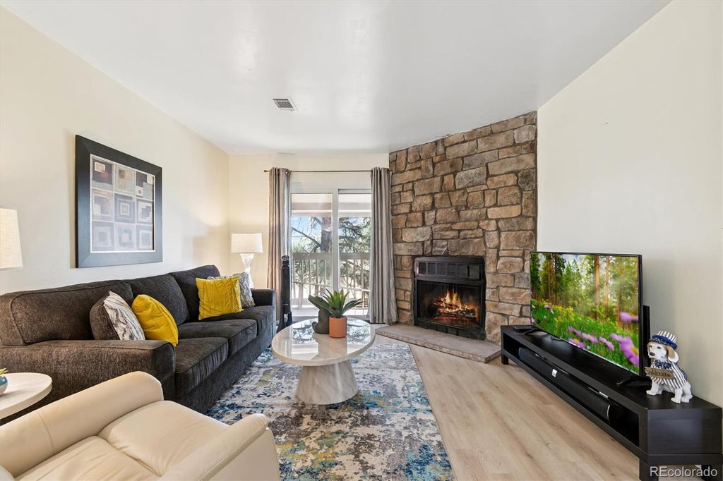 This top-floor condo offers extra privacy with no upstairs neighbors and a private balcony framed by peaceful evergreens. Inside, the living room, dining area, and kitchen connect in a way that feels open, functional, and welcoming—perfect for daily living or hosting friends. Enjoy a cozy wood-burning fireplace, in-unit laundry with washer and dryer included, and a list of fresh updates: a fully renovated bathroom, new stainless steel appliances, new kitchen countertops, updated lighting, and a new patio slider. You'll also have central A/C and your own reserved parking space right out front. The HOA keeps things simple by covering exterior maintenance, water, trash, and more. All this in a prime location—just 10 minutes to Cherry Creek Reservoir, DTC, and Anschutz Medical Campus, with quick access to I-225 and light rail. Priced to sell and move-in ready, this low-maintenance condo offers comfort, convenience, and a great place to call home.