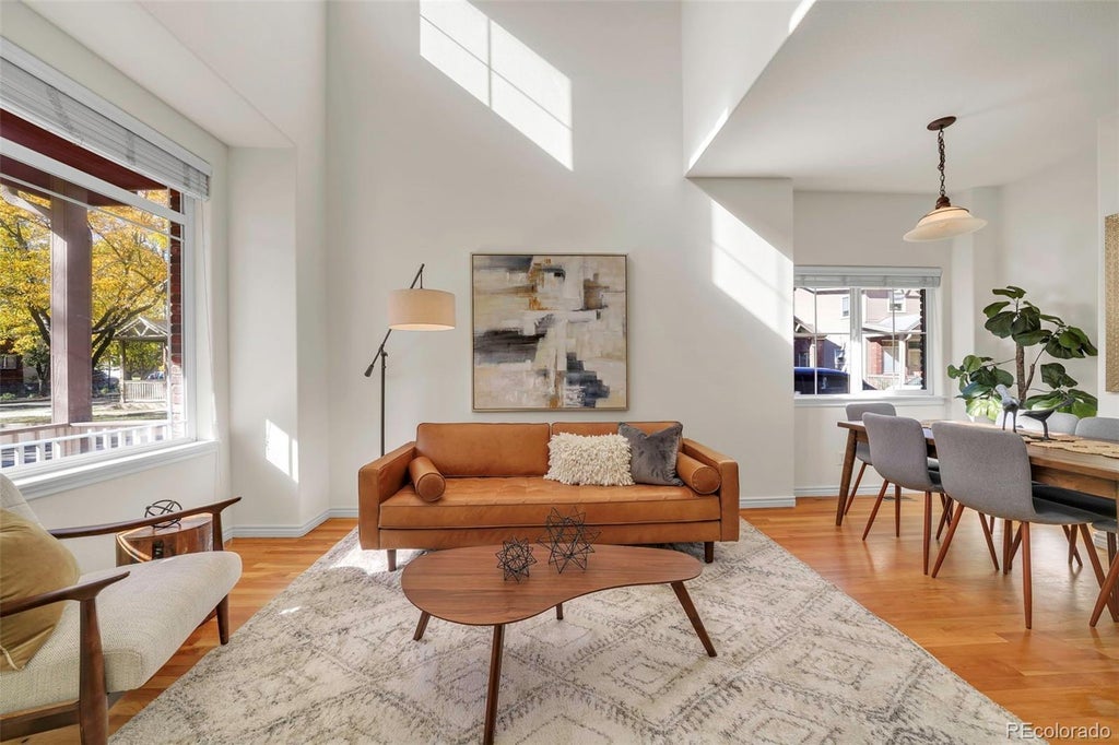Charming three-bedroom townhome in a sweet location! South facing end unit flooded with natural light. Home is situated on a very quiet interior street, with only 1 shared wall! Enjoy looking out over the HOA green space from your covered front porch. New carpet, fresh paint, wood floors on the main level and dramatic vaulted ceilings. Primary bedroom with private bath, walk-in closet, and large south facing windows. Sunny laundry room on the upper level. One-car attached garage. NOT in a metro tax district!