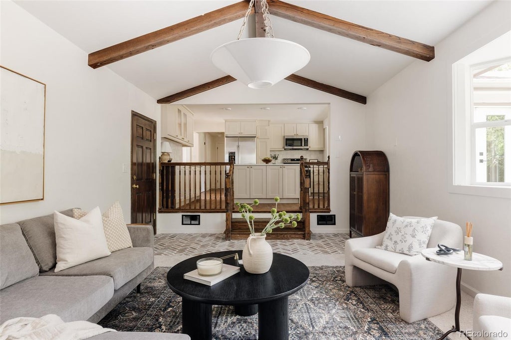 Step inside to a warm and inviting interior. The grand formal sitting room flows seamlessly into an elegant dining room, perfect for hosting gatherings. The heart of the home is the centrally located kitchen, featuring modern appliances and a large walk-in pantry, which opens to a cozy sunken living room. This inviting space boasts striking exposed beams, a wood-burning fireplace, and abundant natural light. Adjacent, the airy dining nook with oversized picture windows offers picturesque views of the lush backyard.