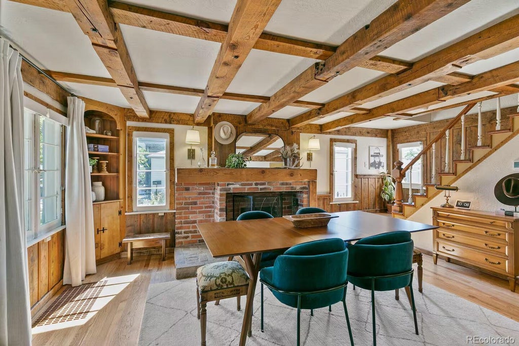 The Red House in Olde Town Arvada is a historic gem—perfectly situated just steps from the heart of the neighborhood, yet quietly tucked away on a peaceful street. With commuter rail access just three blocks south and Memorial Park only a block north, this location offers both vibrancy and tranquility. Inside, character and warmth unfold through original details and thoughtful updates. Sunlight pours through classic paned windows onto gleaming hardwood floors, while hand-hewn ceiling beams and a striking vintage fireplace anchor the dining room with undeniable charm. The living room opens through double doors to a newly designed private patio, creating seamless indoor-outdoor living. Upstairs, the generous primary bedroom gazes out at mature shade trees, while the updated bath impresses with a luxe rain shower. The kitchen and adjoining sunroom capture the home’s cheerful spirit, and the large family room offers a welcoming space to gather. Outdoor living is enhanced with new sod, landscaping, and irrigation, a charming backyard retreat. A detached oversized one-car garage with an attached workshop adds versatility for projects or storage. You will love the finished shed with heat and AC, making an excellent home office or studio. With recent upgrades, including new A/C, updated plumbing, this residence blends historic character with modern ease. Generous basement space primed for your personal design and finishes.. Just moments from trails, parks, breweries, and boutiques, The Red House offers a rare lifestyle—vintage elegance paired with vibrant community energy, in Arvada’s most sought-after neighborhoods.