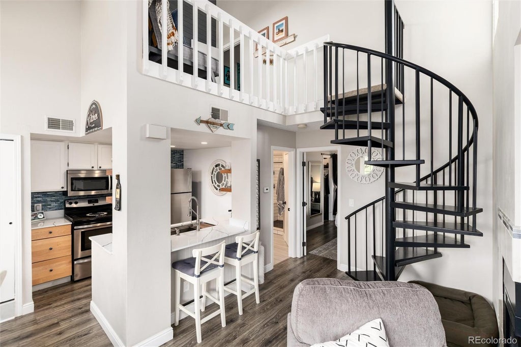 Step into this beautifully remodeled upper-level retreat where charm, comfort, and captivating design come together effortlessly. From the moment you enter, vaulted ceilings and expansive west-facing windows fill the space with natural light and stunning mountain views, creating a bright and airy atmosphere. Featuring a dramatic spiral staircase that adds architectural flair and leads to a versatile loft perfect as a creative retreat or office. The kitchen, which is a showstopper with gleaming S/S appliances, full-height designer tile backsplash, and floating shelves for a modern touch. The luxurious quartz countertops extend to a breakfast bar with seating, creating a seamless connection between cooking, dining, and gathering. With ample prep space, newer luxury vinyl plank flooring, and a deep sink overlooking the fireplace and living area, this kitchen is both elegant and highly functional—ideal for two cooks or casual entertaining. The adjacent dining area is anchored by an oversized arched window, providing gorgeous natural light and lush views of surrounding greenery. The primary suite offers soaring ceilings, a generous window, and direct access to a spa-like bathroom. You'll love the large walk-in shower with exquisite tilework, a counter-height vanity, and stylish lighting. Every detail has been thoughtfully curated to provide comfort and style. Additionally, A private covered front porch with a custom-installed umbrella for added shade and ambiance, shiplap coat rack for a coastal-inspired touch, Newer carpet in the loft with a decorative shiplap accent wall, Some newly installed windows , Brand new exterior staircase with solar lighting for added safety and charm, Community amenities incl a pool, clubhouse, tennis (pickleball?) courts, picnic area, and dog park. This home is not just move-in ready—it’s move-in exceptional. Whether you're entertaining, relaxing, or working from home, this thoughtfully updated home is a true gem you won’t want to miss.