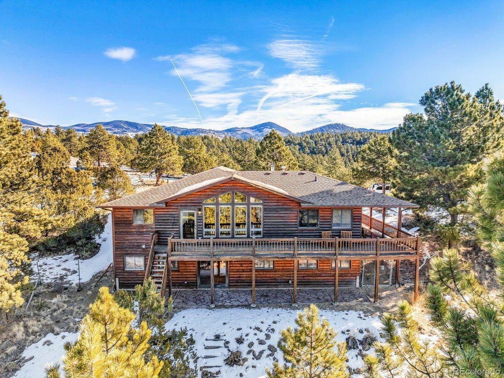 Tucked away in the coveted Schulze Ranch, this FULLY REMODELED D-LOG HOME offers the perfect blend of seclusion and awe-inspiring MOUNTAIN VIEWS. Featuring new luxury vinyl flooring throughout and an updated kitchen with sleek quartz countertops, tile backsplash and new stainless steel appliances. The open-concept layout is highlighted by a cozy wood-burning stove, soaring wood ceilings and beams, and expansive two-story windows that frame panoramic mountain vistas.The main level is designed for easy living, with a spacious primary suite complete with an en-suite bath and walk-in closet. The walkout basement offers a second family room, a second primary suite with its own en-suite bath, and a third bedroom. Outside, a flagstone patio extends from the basement, offering more opportunities to take in the views, while the main level with the wraparound deck is the perfect spot for relaxation or stargazing. Set on a picturesque, rolling lot with abundant pines, this home combines privacy with the serenity of nature. Additional perks include a storage shed and a fenced dog run. This is mountain living at its finest, offering tranquility, beauty, and a connection to the great outdoors.