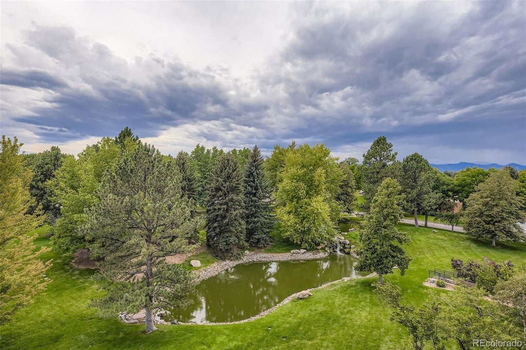 Welcome home to this updated, beautifully appointed SE corner unit with two bedrooms/two full baths. Floor to ceiling windows in living Room and primary bedroom, all with Hunter Douglas motorized shades. Warm wood 42" cabinets, stainless double sink, granite counters, Bosch range, upper microwave and eating space included in kitchen. Refrigerator/washer/dryer can be purchased. Kitchen has pass through window to the dining room, which brings in light from the south facing windows. Large dining area with nice lighting fixture and well-lit serving counter. Spacious living room with streaming sunlight from the windows that feature Pikes Peak and other mountain ranges as well as manicured acreage with trees and pond. Peaceful and inspiring views. Ensuite primary bedroom includes large walk-in closet and updated five piece bath, clawfoot tub, stunning shower and double vanity. Secondary bedroom also has fully remodeled bath. This bedroom opens to a niche and two sides of floor to ceiling windows. Stunning views. Laundry room has full-sized hookups for stack washer/dryer, cabinets and pantry. Laundry room houses the electric heat pump, as your unit supplies and controls own climate and smell. The Waterford property is noteworthy acreage with hundreds of trees, ponds, waterfalls, manicured lawn, flowers, gas grills, picnic and relaxation area and well lit tennis/pickleball courts. Main building includes a Grand Salon for functions/parties as it includes bar area for serving and guest suites for rent. There is an auxiliary fitness center in main building. A large fitness center includes equipment, indoor/outdoor pool, hot tub, steam rooms, showers/lockers, pool table and table tennis. There is a party room with fireplace, which includes kitchenette. Waterford provides a magnificent living experience. Unit has a convenient parking and storage space. Driveways to the garage are heated. A front doorman is on site 24/7 to greet your guests and receive packages.