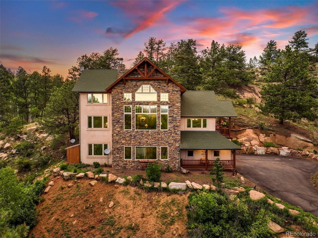 Welcome to 71 Crestone Circle in Florissant—where comfort, craftsmanship, and Colorado beauty come together in this exceptional 1.5-story stucco and stone home with a finished walk-out basement and sweeping views of Pikes Peak on 7.98 acres. This thoughtfully designed 3-bedroom, 3-bathroom home offers spacious living across three levels, all serviced by a built-in elevator. The great room stuns with a magnificent 1.5 story stone fireplace and a wall of windows that perfectly frame Pikes Peak, while stone built-ins and radiant in-floor heat add warmth and character. Step outside to the wrap-around composite deck, ideal for soaking in the scenery, hosting guests, or simply enjoying quiet moments surrounded by nature. Inside, you’ll find standout details including pinewood doors and trim, custom wood railings with wrought iron inlays, and a workshop/hobby room for your creative side. The chef’s kitchen is outfitted with double ovens, a warming drawer, trash compactor, walk-in pantry, and a new black cooktop installed June 2025. A built-in bench in the primary suite’s stand-up shower, immersive views of rock formations from the grand soaker tub, and expansive Pikes Peak views from the bedroom make the owner’s retreat extra special. Additional highlights include: new well installed in 2018, LVP flooring upstairs added in 2019, owned ADT security system installed in 2023, 2-car attached garage, asphalt driveway, cut and stacked firewood left on-site at the main home and the A-Frame. As a unique bonus, the property includes a charming 425 square foot A-frame guest cabin built in 1985, complete with its own septic system, 1 bedroom, 1 bathroom, a kitchenette, and its own wrap-around deck—perfect for guests, multi-generational living, or rental potential. Set among beautiful rock formations and a tranquil aspen grove, this one-of-a-kind mountain retreat offers the best of Colorado living—peaceful, private, and perfectly positioned to enjoy nature in all seasons.