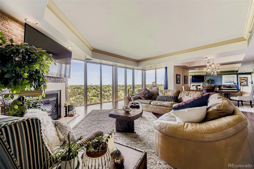 This is luxury high-rise living in highly acclaimed Cherry Hills. Take advantage of the 2.375% ASSUMABLE loan and jaw-dropping list price. This gorgeous North East corner unit has BREATHTAKING panoramic views of the Mile High. Sunrise to Sunset, views galore. Floor plan is perfect for a live/work, roommate or Mother-in-law. Two large bedrooms both boasting full baths, walk-in closets and floor to ceiling windows. Split suite design offering full privacy. Primary Bedroom flaunts an over-sized walk in closet and spa tub with views to get lost in. Open living area features 9 foot ceilings throughout, gorgeous fireplace, floor to ceiling windows with unobstructed views and proper dining area with built in storage butler. Urban contemporary style brick featured in kitchen/living area offers that hip Denver "loft" feel. Stainless appliances. Quaint cocktail/coffee bar, perfect for entertaining. No stairs. Single level living. Two side by side parking spots (Level B2 - #299/#300) in secure underground/heated garage, steps away from building entry/elevators. Secure/private XL storage unit (A11), just adjacent of dedicated parking. Impeccably maintained grounds and stunning landscape including mature trees, ponds and waterfall. Located conveniently to Downtown, DTC, dining, shopping, hospitals and entertainment. 1st class HOA services including: 24 hour security guard, concierge, secure underground parking, secure/temp controlled storage units, underground bike storage, secure package delivery, window washing twice a year, fitness center including heated indoor/outdoor pool, spa, steam rooms, meeting/party rooms, outdoor gas grills, fire pit, pool table, racquetball court, tennis/pickle ball courts, guest rental suites, all on 7.5 acre grounds. Social activities including happy hours/holiday events. Worth every penny!! Lock and go lifestyle, no worries. Opportunity to make this home your "living" work of art. You'll love it here!