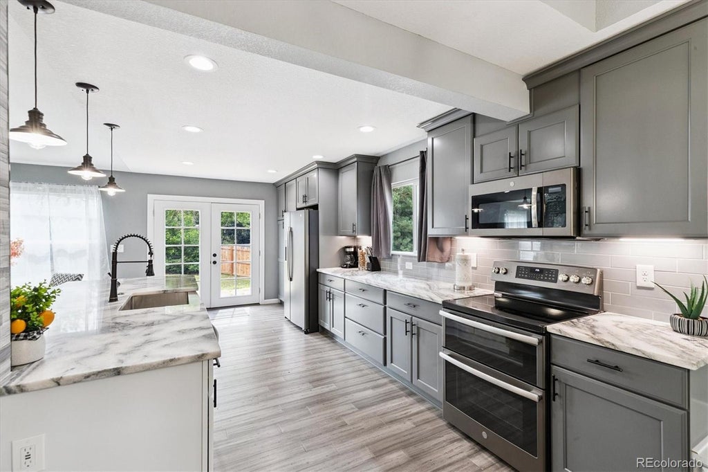 Welcome to this beautifully updated and fully remodeled 6-bedroom, 3-bath home tucked away on a quiet cul-de-sac. Completely renovated within the past five years with high-end finishes throughout, this home is truly move-in ready. Step inside to an open floor plan that offers seamless flow between the living, dining, and kitchen areas—perfect for both everyday living and entertaining. The spacious living room creates a warm, inviting atmosphere, while the kitchen shines with modern finishes, an eat-in island, and a built-in breakfast nook. The primary suite provides a relaxing retreat with an en-suite bath featuring a dual-sink vanity and large walk-in shower. Generously sized secondary bedrooms offer comfort and flexibility for family, guests, or a home office. The finished basement is a standout, featuring conforming bedrooms with egress windows, a 3/4 bath, a versatile great room, and a dedicated workout room—ideal for a home theater, gym, or playroom. Outside, you’ll find brand-new exterior paint, a large, fenced backyard with privacy, and a storage shed, offering plenty of room for outdoor activities and gatherings. Located in the highly sought-after Cherry Creek School District and just minutes from shopping, groceries, fitness centers, and major routes like I-225 and S. Parker Rd, commuting is a breeze. Outdoor enthusiasts will love the proximity to Cherry Creek Reservoir, while public transit is just a short walk away for added convenience. Don’t miss the opportunity to own this stunning, fully remodeled home in a highly desirable location!