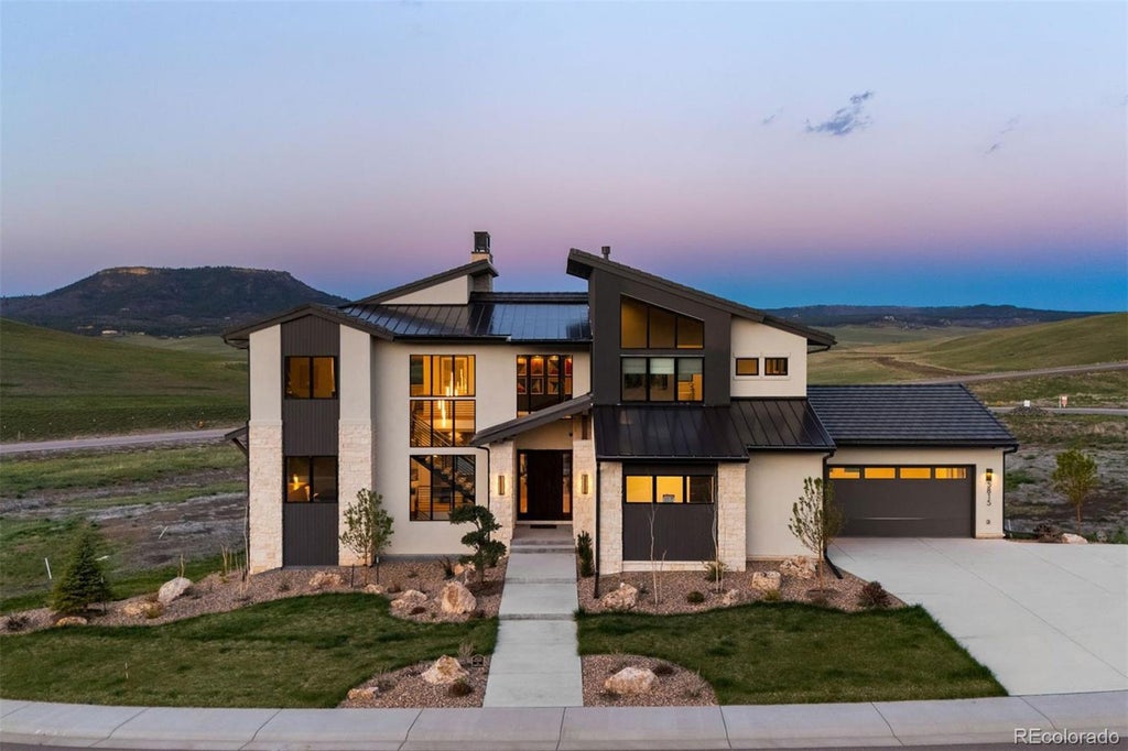 Inside, wide-plank white oak floors stretch across the main level, flowing through open spaces grounded by clean lines and elevated finishes. A floating open-riser staircase with horizontal iron railings sets the tone in the entry, while large windows bring in ever-changing light. The great room features 13-foot ceilings, a modern chandelier, and a fireplace that acts as both anchor and art piece—wrapped in marble and framed by white oak tongue-and-groove. The kitchen continues the visual story with white oak floor-to-ceiling cabinetry, a quartz waterfall island, and top-tier Monogram appliances. Two sliding doors extend the living space to a full-length covered deck that captures morning sun and quiet evenings alike. The primary suite is a retreat in every sense. A double-door entry leads to a vaulted ceiling with tongue-and-groove detail, a cozy fireplace with modern tile and wallpaper accents, and an L-shaped window bench that perfectly frames the views. Dual walk-in closets with built-ins offer generous storage, while the spa-worthy bath includes a freestanding tub, frameless shower with multiple heads, and dual floating marble vanities. On the lower level, the recreation room continues the home’s thoughtful design with the same marble-and-oak fireplace, space for a game table, and a sleek wet bar with open shelving and a drink fridge. Sliding doors open to a covered patio and grassy lawn. The exercise room keeps energy high with wood floors, mirrored walls, and built-in speakers. A playful kids’ zone with a built-in fort and Dutch door adds charm, while guest quarters and storage rooms bring comfort and function full circle. Located 25 minutes from downtown Castle Rock and with easy access to both Denver and Colorado Springs. Some homes are beautiful. Others are bold. This one gets it just right.