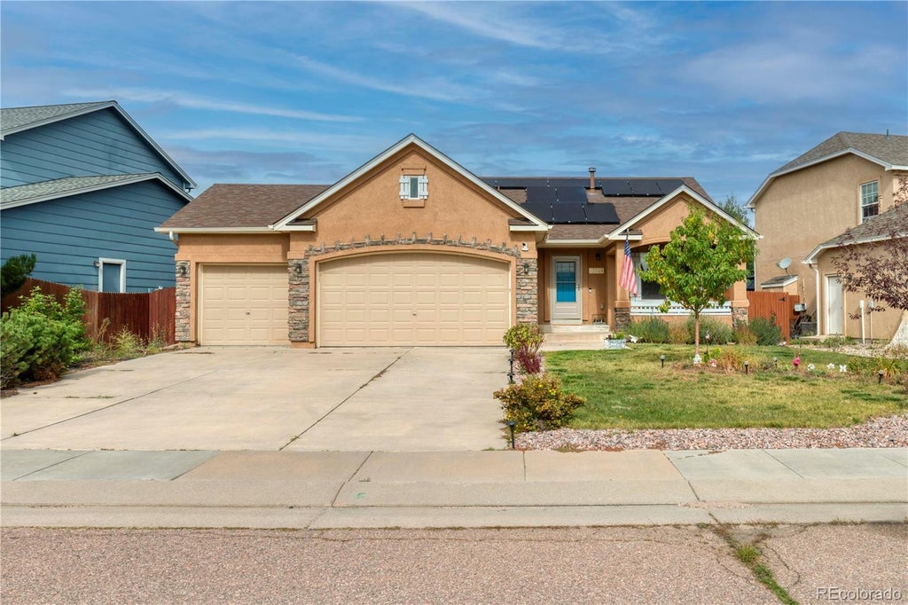 Beautifully maintained ranch-style home in the sought-after Meridian Ranch community. This spacious 4-bedroom, 3-bathroom residence offers over 2,500 finished square feet with a functional open layout and tasteful finishes throughout. The main level features soaring vaulted ceilings, a bright and open great room with a cozy gas fireplace, and a well-appointed kitchen with quartz countertops, abundant cabinet space, and a convenient breakfast bar. The primary suite includes a walk-in closet and private 5-piece bath. The finished basement expands the living space with a large family/rec room, 2 additional bedrooms, and full bath—ideal for entertaining or guest accommodations. Exterior highlights include attractive stucco with stone accents, a 3-car attached garage, fenced backyard, and low-maintenance landscaping. Enjoy all the amenities Meridian Ranch has to offer, including community parks, trails, recreation center, fitness facilities, pool, and golf course—all with easy access to