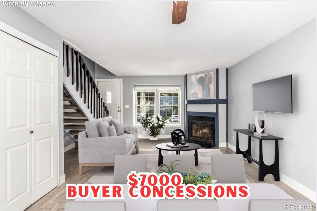 ***SELLERS OFFERING $7000 BUYER CONCESSIONS Modern comfort meets convenience in this fantastic end-unit townhome in Dakota Station! The charming front porch welcomes you into a light-filled interior with a neutral palette and newer laminate wood plank flooring downstairs. The open-concept great room features a large coat closet, dining area with a ceiling fan, and a cozy wood-burning fireplace with mantle, creating a warm and inviting atmosphere. The kitchen offers granite counters, a decorative mosaic tile backsplash, on-trend blue cabinetry, a center island, pantry, built-in appliances, and access to your private cozy backyard. Upstairs, vaulted ceilings enhance the airy feel of the two spacious bedrooms. The primary bedroom features a triple-wide closet and offers direct access to the full bathroom. You’ll also find a linen closet and a laundry closet with an included LG front-load washer and dryer for your convenience. Enjoy both indoor and outdoor living with a private, fenced-in yard, perfect for summer BBQs, featuring a patio, artificial turf, and an outside storage shed. Additional perks include a deeded parking spot, plenty of guest parking, and access to the community pool. Fantastic Littleton location! Just minutes from shopping, dining, parks, trails, schools, and the rec center. Don’t miss this move-in-ready gem, welcome home! ***Considered a condominium for lending purposes, but lives like a townhome.