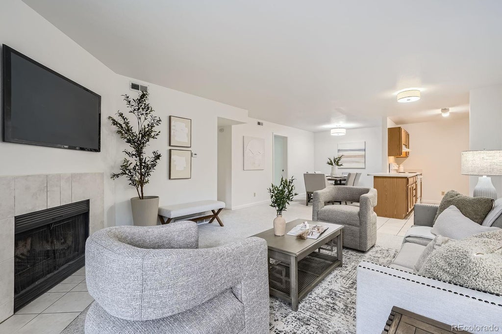 Welcome to this inviting 2-bedroom, 2-bathroom condo, ideally located in the heart of Lakewood. With over 1,000 square feet of comfortable living space, this ground-level unit is freshly updated with new carpet and paint, enhancing its bright, open floor plan. Cozy up by the charming wood-burning fireplace or enjoy the serenity of your private patio. Large windows fill the spacious rooms with natural light, offering tranquil views of the green space from the office/second bedroom. The kitchen features ample counter space and storage, while the dining area is perfect for gatherings. Enjoy the convenience of in-unit laundry and the added benefits of community amenities like a pool and hot tub. Situated near Green Mountain's scenic trails, grocery stores, restaurants, and public transit, you're just minutes from Red Rocks Community College, the School of Mines, St. Anthony's, and the Federal Center. Discover a prime location and a perfect living space here in Lakewood.