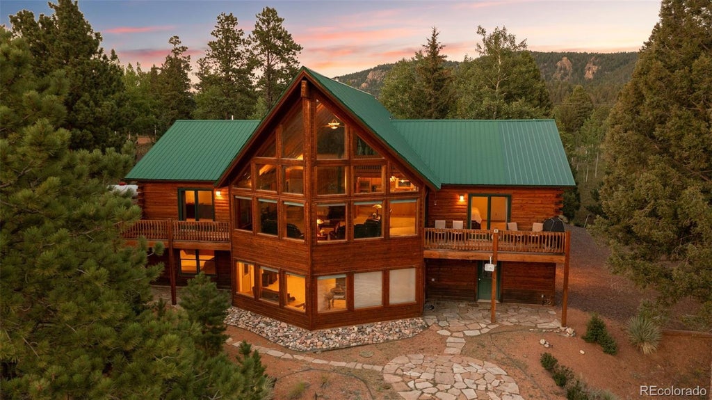Welcome to your fully furnished Colorado mountain retreat—a luxurious log home on 5 private acres, perfectly positioned for peace, privacy, and unforgettable views. Whether you're dreaming of a full-time escape or a second home, this property offers a seamless blend of rustic charm, modern comfort, and thoughtful upgrades that make it completely move-in ready. The great room makes a stunning first impression with its soaring vaulted wood-beam ceilings, a wall of floor-to-ceiling windows framing the natural landscape, and a high-efficiency wood stove for cozy Colorado nights. French doors open to a massive wraparound deck—perfect for morning coffee, sunset wine, or stargazing under the mountain sky. The gourmet kitchen features custom hickory cabinetry with pull-out shelves, a pantry, breakfast bar, Thermador gas cooktop, double convection ovens, Bosch dishwasher, and ample counter space. It flows effortlessly into the open living space for ideal entertaining. Two main-level master suites offer privacy and luxury—one with a spa-like 5-piece bath featuring an oversized jetted tub and dual-head walk-in shower, the other with its own bath and a bonus room perfect for a sitting area, office, or private guest quarters. Downstairs, the walk-out basement includes two spacious bedrooms, a full bath, and a huge office/flex space that opens to a serene patio surrounded by native landscaping and Telluride gold rock retaining walls. Rebuilt washout with professional rockwork, ensuring long-term stability and curb appeal Outside, the home is beautifully landscaped with a drip system, mature trees, and natural boulders. The 3-car attached garage includes a workshop and ample storage space. The property is pre-wired for a hot tub and outfitted with speaker wiring both inside and out. *BONUS—This home is being sold FULLY FURNISHED, making it truly turn-key and ready for immediate enjoyment or income potential as a high-end mountain rental.