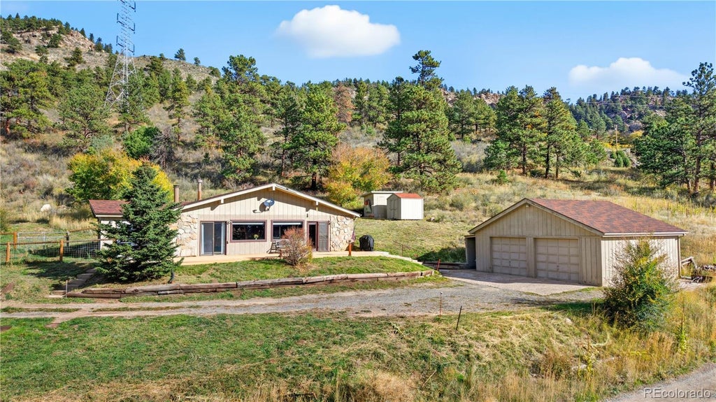 Great Location so close to I-70, very near to the top of Floyd Hill. Beat the traffic to the ski area's! Only 45 minutes to Loveland Skiing. Great for commuters too! Only 22 minutes to Golden. Highly desired Main floor living! Comfortable & spacious 1,360 sq.ft. 3 bedroom, 2 bath, plus large den and lots of storage on a gently sloping nearly one acre. Large grassed fenced dog run for your furry friends. Lots of windows to take in the views of the rolling treed foothills! Enter the home from the front full length trex deck that's great for entertaining! Step into the newly carpeted extended dining/ living room combo with attractive woodstove for cozy warmth on those snowy days. Or, enter at the Den entry to unload from a busy day. Galley Kitchen offers double oven range, portable dishwasher, refrigerator with an extra wall of cabinets nearby in the dining room plus a very large pantry for all your cooking needs! Primary bedroom has a newly updated 3/4 bath! Then ramble down the hallway to a 2nd spacious full bathroom and two more bedrooms, plus the main floor Laundry/utility room. This home is energy efficient being built partially into the hill; called a berm home, southern exposure, passive solar, sun drenched! Front windows are triple pane! Saves on heating and cooling! Step up only a couple feet onto the roof from the back of the home. Guys and gals! You can do all the extra projects you dream up in the detached oversized 2 car garage with plenty of workspace! Walking distance to Open Space for hiking! 10 minute convenience to Evergreen shopping & dining for all your needs!