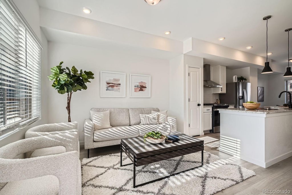 OCTOBER 2025 Completion Step into this beautifully designed 2-story end unit townhome featuring 9’ ceilings on the main level and an open-concept layout perfect for entertaining. The kitchen impresses with 42" upgraded soft-close cabinets, a massive 10-foot island, quartz countertops, a tile backsplash, and upgraded stainless steel Whirlpool appliances including a gas range. The main level boasts luxury vinyl plank flooring, while the stairs and upper level feature plush carpet for added comfort. Additional upgrades include black bronze hardware throughout, 2" faux wood blinds on every window, and an in-unit laundry space for convenience. Located in the forward-thinking Geos community, this home offers energy-conscious living in a walkable, compact neighborhood with amenities close at hand. A perfect blend of style, function, and sustainability! *Photos are a representation of the same floorplan - NOT exact unit*