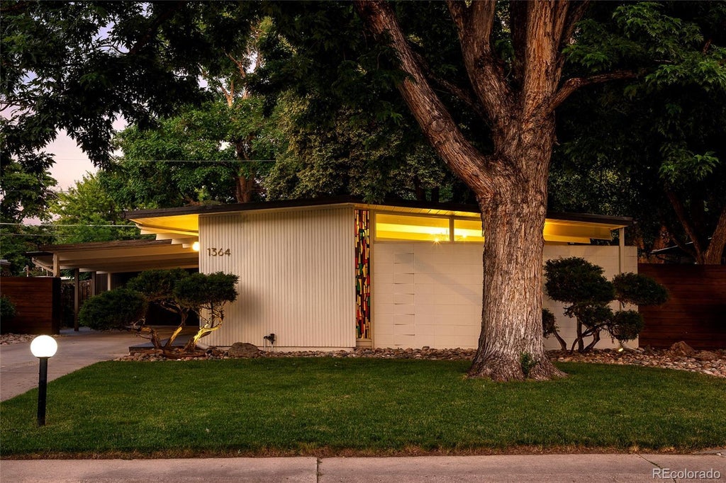 Built in 1955 in the iconic Eichler style, this meticulously renovated 2-bed, 2-bath home offers the timeless character of mid-century design paired with thoughtful, high-end updates throughout - this home is totally turnkey. Tucked beneath the canopy of three stunning mature trees, the home sits deep on a spacious lot with a long driveway and oversized carport (wide enough for 2 cars) —offering both privacy and expansion potential. A feeling of calm comfort fills each room, with a green, lush outdoor oasis right outside making the whole home a peaceful retreat. The entire exterior and interior of the home have been freshly repainted, highlighting its clean lines and modern warmth. Inside, you’ll find premium upgrades throughout: two fully remodeled bathrooms, a sleek modern kitchen with top-tier appliances and fixtures, heated floors in the primary bathroom, and all-new interior and exterior doors. A new floor-to-ceiling window in the living room brings in abundant natural light and frames the tranquil, tree-lined backyard. The outdoor spaces are equally impressive. The thoughtfully designed landscaping includes a serene side courtyard, a tranquil garden fountain, and exterior lightscaping. Whether entertaining or relaxing, it feels like a private retreat. The spacious storage shed at the end of the carport currently serves as a home gym and storage space, and adds over 200 sq ft of useful additional space. Additional upgrades include a new A/C system (2020), gas fireplace insert, custom closet systems, and elegant tile and lighting selections throughout. Perfectly located just 10 minutes from Cherry Creek, 15 minutes from DTC, and 35 minutes from the airport, with walkability to coffee shops, bakeries, restaurants, and a new grocery store coming soon. You’re also just 4 minutes to Cherry Creek Trail for outdoor adventures. This home has been lovingly cared for and is priced to go. Step inside and feel like you’re on vacation—every day.