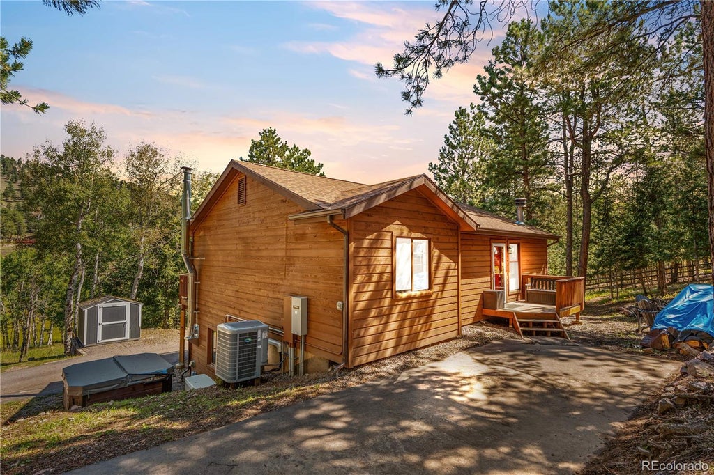 Enjoy peace and tranquility in this modernized mountainous retreat! Placed on a nearly 5 acre private lot. You'll love the stunning views of the Colorado sunrise and sunsets, frequent wildlife viewings, all the perks of mountain living, yet still only less an hour away from Denver! The open floor-plan of the main level greets you with beautiful bamboo flooring, high ceilings and a boasting wood burning fireplace. The kitchen is equipped with a full stainless steel appliance package including a gas range, perfect for any home chef! The kitchen seamlessly connects the dining area and a deck giving you more options and space for dining or entertaining. The main level also includes a full bathroom and two generous sized bedrooms, one bedroom having walk-in closet space, main bathroom access and sliding doors to the deck. You'll enjoy the lower level walk-out basement just as much when you embark the bonus room perfect for billiards, workout or movie room. Not only do you have the option of using the wood burning stove or gas furnace to heat the home but you also have a new whole home generator, new cold climate heat pump HVAC system, cold climate heat pump system to garage and detached sleeping quarters, Essency electric on demand hot water heater and A/C! The HUGE primary bedroom is also located in the basement and includes a primary 3/4 bath, walk-in closet and sliding door access to the HOT TUB! You'll love your over-sized heated garage with plenty of extra storage and attached sleeping quarters or studio that is heated and has A/C. The perks of this home just keep coming with the radiant floor bathroom heat, security system, high speed internet, zip line, in-ground trampoline, paved driveway, fire pit, dog run, electric gate and fencing, fenced area that includes a barn and chicken coop, sellers are including the ATV with plow for your convenience. RV parking has electrical and sewer hook-ups. Property is fully fenced with the majority of the lot being undeveloped.