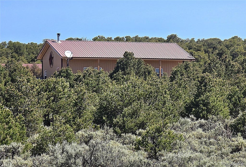 Experience the charm of off-grid living in this Southern Colorado home situated on 35 acres. This nearly 1,700-square-foot home features an open floor plan with 2 bedrooms and 1 bathroom. Designed with quality craftsmanship, the house boasts 12-foot ceilings, Navien tankless water heater, all appliances, Hearthstone wood burning stove, spray-in insulation, low/no maintenance metal siding and roofing, a fully owned solar system, a 1,400-gallon cistern, a wood splitter, and a generator. The outdoor amenities include a 32 x 13 garage with ample attic storage, a one-car carport, a storage shed, and a lean-to currently used for wood storage. Additional highlights are the covered front porch, open deck, and a seating area with a firepit, perfect for relaxing and enjoying the serene views and privacy. Year-round accessibility with no HOA! This home is move-in ready and ready to be enjoyed!