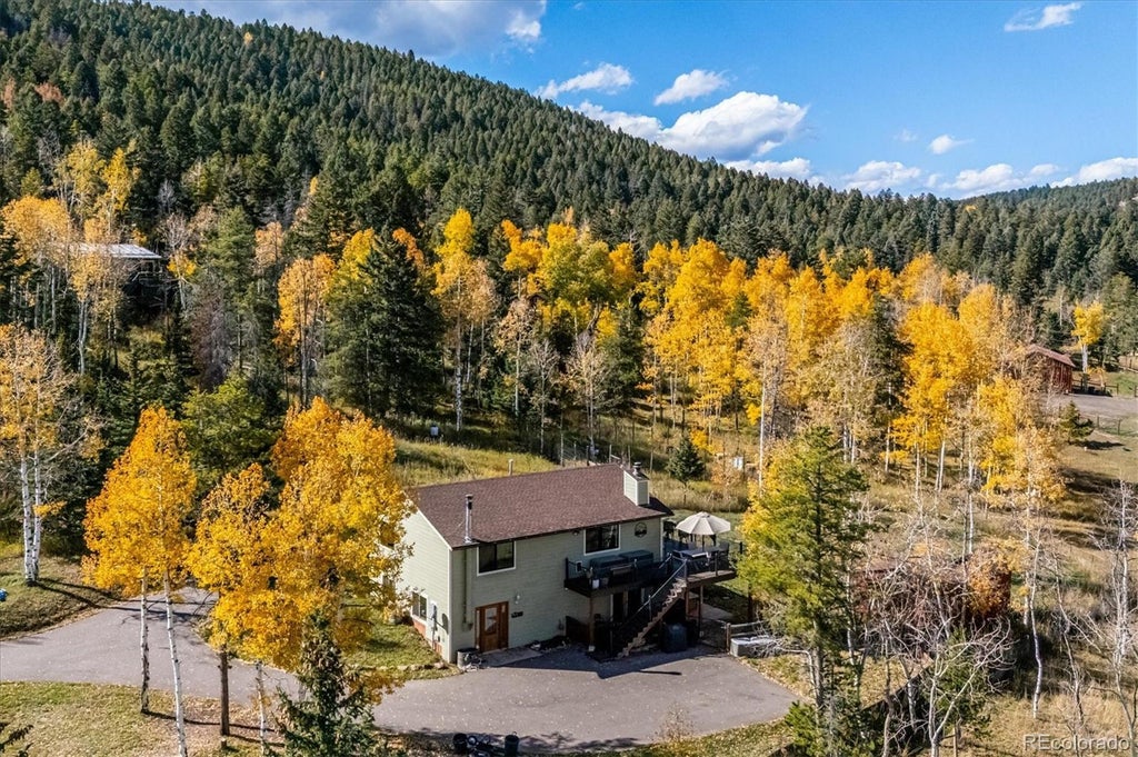 Nestled among the Aspens in the highly sought-after community of Silver Ranch Estates, this stunning home offers the perfect blend of comfort, style, and breathtaking natural beauty. Located on a quiet cul-de-sac, you'll enjoy peace, privacy, and unmatched 360-degree mountain views that make this property truly one of a kind. The bright, open-concept kitchen is ideal for entertaining, featuring a spacious island, stainless steel appliances, soft-close cabinetry, granite countertops, a charming farmhouse sink, and plenty of natural light. The adjacent great room showcases soaring tongue-and-groove vaulted ceilings and a cozy, yet expansive atmosphere perfect for gatherings or quiet evenings. Open the impressive wall of glass bi-fold doors to seamlessly extend your living space onto the expansive deck—perfect for taking in the views or enjoying Colorado’s fresh mountain air. When the weather turns, head downstairs to the covered patio with a rain-free roof system, allowing you to stay outside and dry no matter the forecast. Warm up during snowy winter nights by one of the two highly efficient wood stoves, which also help significantly reduce heating costs. Additional energy-efficient features include new windows upstairs, a tankless hot water heater, and ceiling fans throughout. This home was built with long-term durability in mind, featuring impact-resistant shingles and cement board siding—features that may qualify for reduced homeowner’s insurance premiums. The domestic well (with both UV and canister filters) is permitted for watering a horse or small livestock. Additional features include a reverse osmosis water purification system, paved driveway, and a spacious shed/workshop for all your toys. Don't miss this unique opportunity to own a piece of mountain paradise. Schedule your private showing today!