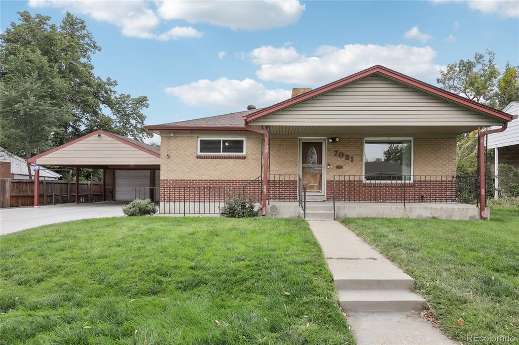 Welcome to this charming North Denver home, ready for its next owner! A covered front porch with space for seating sets the tone, leading into a bright living room at the front of the home. The kitchen is conveniently located just off the living room and features quartz countertops, stainless steel appliances, and a stylish tile backsplash. Two bedrooms and a 3/4 bath complete the main level. The finished basement offers incredible flexibility with a large family/bonus room, two non-conforming bedrooms, an additional 3/4 bath, and a spacious laundry room with utility sink, cabinets, and built-in shelving for extra storage. Outdoor living is a highlight with a large covered patio perfect for dining or relaxing, plus a pergola-covered fire pit, garden area, and storage shed. The detached 2-car garage includes space for a workshop, while two covered carport spots and a generous driveway add even more parking options. Additional updates include a newly installed HVAC system (April 2025), giving you peace of mind for years to come. Located near two elementary schools with quick interstate access, this home is just a short walk to Twin Lakes Park with its walking and biking trails. A tranquil neighborhood with a true sense of community, yet close to life’s everyday conveniences—this home offers the best of both worlds.