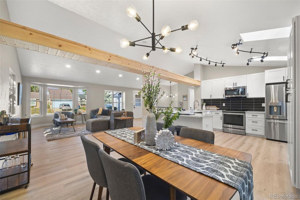 Welcome to this beautifully updated Westminster home! Step inside to find fresh laminate flooring, new lighting, a stunning wood-wrapped post and beam, and a bright, open kitchen featuring quartz counters, white shaker cabinets, new stainless steel appliances, and a spacious pantry. The bathrooms shine with new tile, vanities, and lighting. The vaulted ceiling and skylights on the main level create an airy feel, and the primary bedroom boasts a walk-in closet. Downstairs, enjoy a large family room, an updated 3/4 bath, a bedroom with an egress window, extra storage space, and a utility room with washer and dryer included. Major systems are already taken care of with a new roof, water heater, furnace, and air conditioner. Outside, the front yard is xeriscaped for easy maintenance, and the large back deck is perfect for entertaining. Conveniently located near Ryan Elementary and Park, Sherwood Park, and plenty of shopping, dining, and entertainment options — this home is move-in ready and waiting for you!