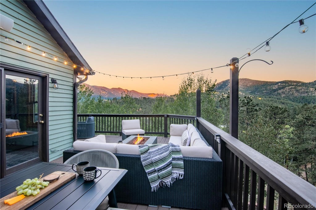 Stunning mountain retreat on 3 private acres with breathtaking panoramic mountain views, this spacious home offers both comfort and character just 2 miles from charming downtown Bailey. You will be impressed from the minute you walk in the door! This professionally designed mountain home is a true showcase of craftsmanship and impeccable taste. The large open living room features a cozy wood stove and a wall of windows that flood the space with natural light, frame the stunning scenery and allow in the fresh mountain air breeze. The open dining area flows seamlessly to a wraparound deck, perfect for entertaining or relaxing while soaking in the sunset views. The kitchen is a unique, custom space that overlooks the deck and features a skylight, modern appliances and a built-in speaker system. The Kitchen is open to a flex space overlooking the backyard and could be used as a coffee nook, office or play area for children while meals are prepped. Adjacent is a powder bath and laundry/mudroom with abundant shelving & yard access. The main-level primary suite overlooks more mountain views, features a jetted tub, newly remodeled shower, and a walk-in closet. Head downstairs to a cozy family room featuring a pellet stove, sliding door access to the outside, and rich wood accents. You’ll find 2 additional bedrooms, a full bath, and a bonus room perfect for an office, gym, or 4th bedroom (non-conforming). Custom railings, huge picture windows, and high-end finishes throughout make this home one-of-a-kind. This home has had numerous upgrades since 2022 including the conversion to natural gas, a new central heat furnace, new well pump equipment, water heater & built-in water filtration system, repaved driveway, new appliances and more! Enjoy the fresh mountain air by the fire, explore nearby trails, ski resorts, or Red Rocks—all within reach. This Colorado mountain dream home with four season unique views is move-in ready!