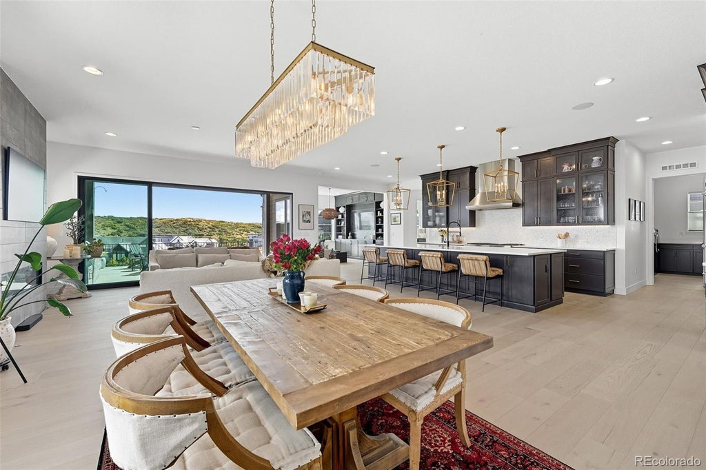 Exquisite Modern Retreat in The Canyons - this Shea Homes masterpiece blends luxury, privacy, and natural beauty. Backing to protected open space with sweeping views of Castle Pines ridge and Hess Reservoir, the home combines modern design with thoughtful functionality. Expansive ridge views greet you through retractable nano doors that extend the living space to a deck with fire pit and built-in grill, perfect for morning coffee or sunset gatherings. The open-concept main level features engineered hardwood floors, a gourmet kitchen with Sub-Zero and Wolf appliances, a sprawling island, and a cozy study room with custom built-ins. Automated Hunter Douglas blinds in the primary suite and study allow customizable light control, even programmable for gentle sunrise wake-ups. The spa-inspired primary suite offers a rain shower with glass enclosure and bench, plus a California Closets walk-in connected to the laundry room. The walkout lower level opens to a landscaped yard framed by mature pines, aspens, and natural boulders. This level includes two guest bedrooms, wet bar with mini fridge and dishwasher, and two unfinished storage rooms, one suited for a gym or future suite. A tankless water heater and whole-house humidifier add efficiency and comfort. Iron railings, Sonos sound in kitchen, deck, and suite, plus covered patios at front and back complete the thoughtful design. The Canyons community elevates the lifestyle with coffee, cocktails, and dining at The Canyons House, pool, and pickleball courts just a short walk away. Peaceful, private, and impeccably designed, this residence is more than a home-it's a lifestyle.
