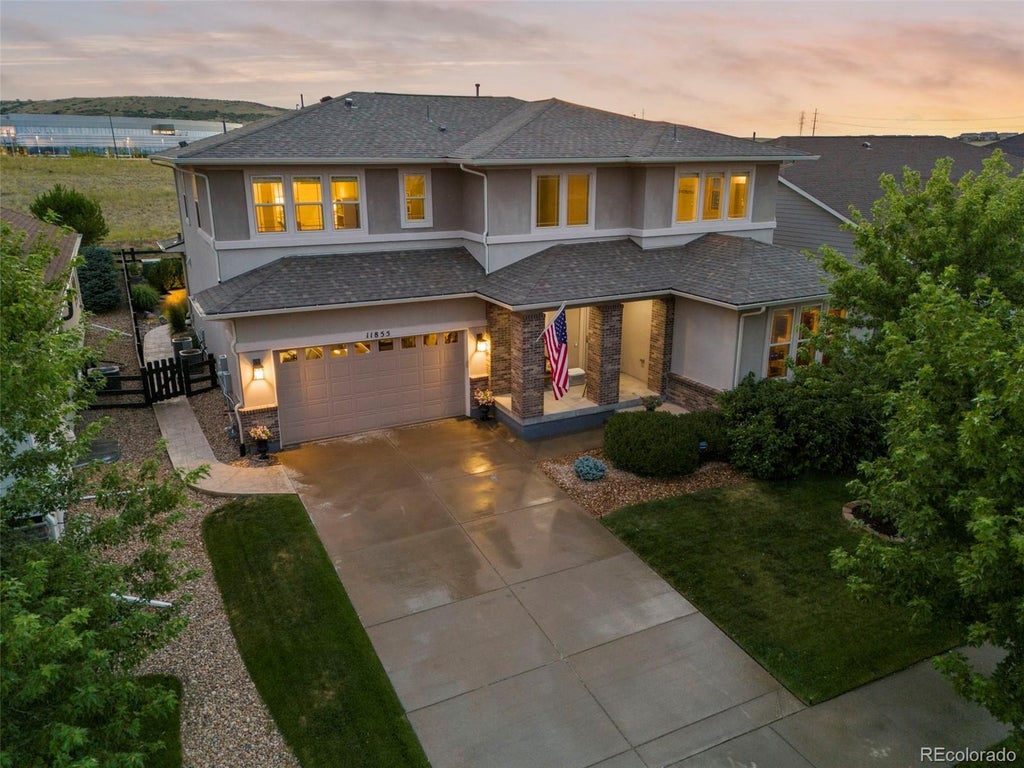Meticulously maintained Acadia model backing to open space in the highly sought-after Heirloom neighborhood of Parker. This 4-bed, 4-bath home offers 4,345 total sq ft and a spacious second-floor loft. The main floor welcomes you with vaulted ceilings, wrought iron railing, hardwood floors, and a stylish wallpaper accent wall. The fully remodeled chef’s kitchen boasts dual quartz islands, 42” ivory cabinets, Thermador 5-burner gas cooktop and oven, Wolf convection/steam oven, Sub-Zero fridge, butcher block with compost cut-out, pendant lighting, huge walk-in pantry, breakfast nook, and a 15x10 second pantry/mud room. Enjoy the cozy family room with a two-sided reclaimed wood gas fireplace and a formal dining room with adjacent butler’s pantry featuring quartz counters, hammered copper sink, and beverage fridge. Also on the main level: a powder bath and guest bedroom/study with ensuite bath. Upstairs, a 20.5x14 loft offers space for a second living area or potential 5th bedroom. The private primary suite showcases stunning Reuter-Hess views, dual vanities, soaking tub, glass shower, and dual walk-in closets. Two additional bedrooms share a Jack-and-Jill bath with upgraded finishes, plus a convenient second-floor laundry room. The 848 sq ft open basement is plumbed and ready to finish. Outside, enjoy a professionally landscaped yard with Jellyfish lighting, large paver patio with Arcadia pergola (adjustable louvers + sunshade), firepit area, mature trees, shrubs, and flowers. Minutes from Rueter-Hess Reservoir, Incline Challenge, East/West Trail, I-25, Downtown Parker, Cherry Creek Trail, DTC (15 min), and DIA (25 min)!