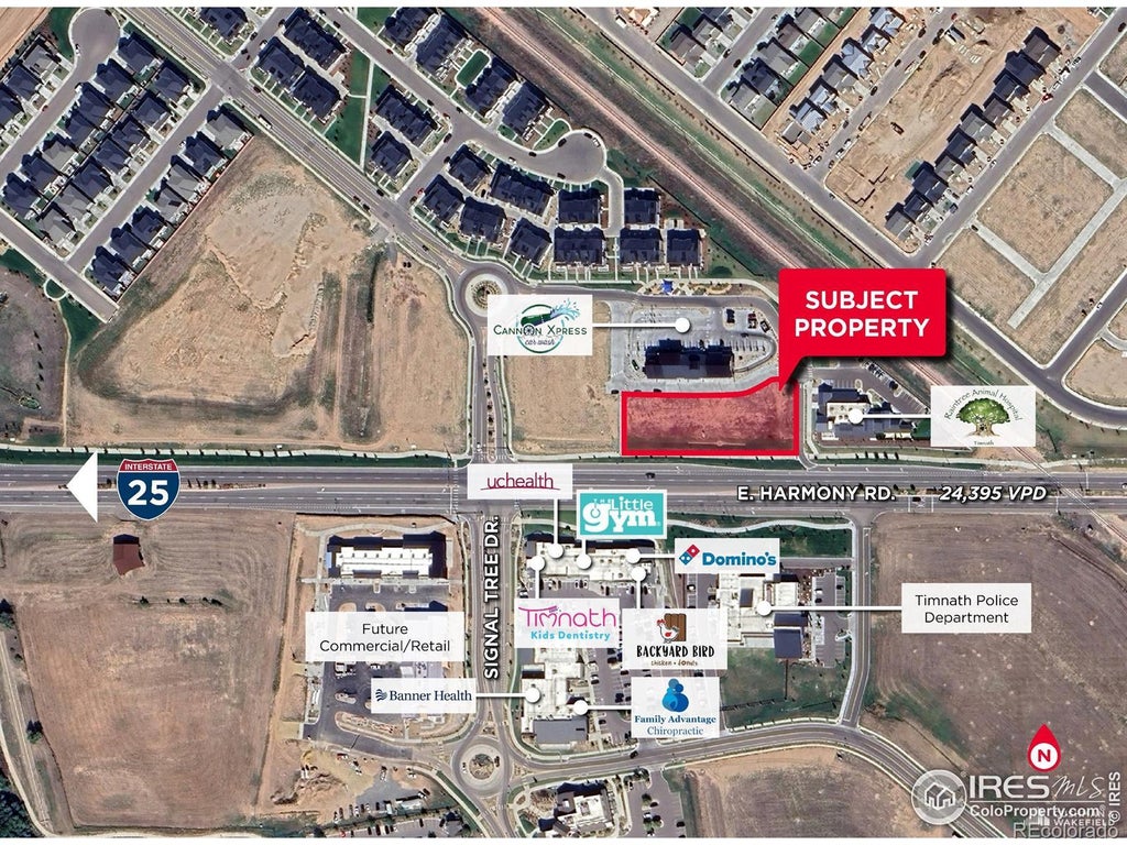 Land Size: 0.675-1.35 Acres. Sale Price: $30.00/SF. 5590 E Harmony Road features two 0.675-acre commercial lots available for sale or build-to-suit. Located less than one mile from I-25 on Harmony Road, this site is ideal for professional service businesses such as dental offices, retail shops, or quick-service restaurants. It enjoys a steady flow of traffic from the nearby car wash, enhancing visibility and accessibility.