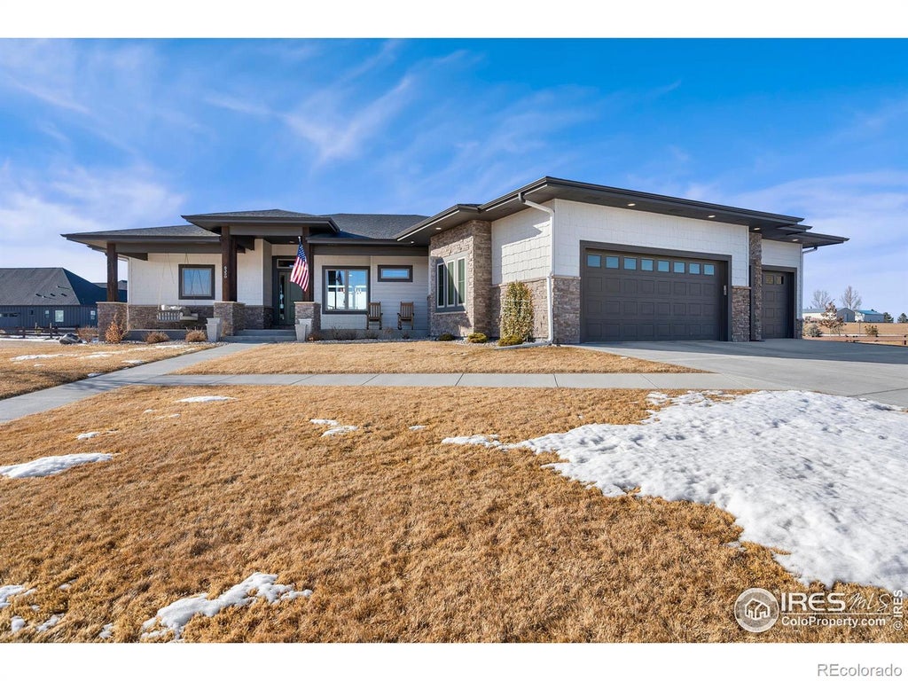 Incredible value, plus Seller is offering up to 2% concession toward rate buydown and closing costs! Contact agent for preferred lender info to learn about temporary buydowns with rates starting the the 3's! Elegance and quality abound in this expertly-crafted custom ranch! Situated on a half-acre in a quiet corner of Timnath's celebrated Wildwing community. The main level is airy and wide open, with soaring ceilings and light pouring in from the westerly wall of glass. Cozy up around the grand floor-to-ceiling stone fireplace or enjoy meal prep and conversation in the spacious gourmet kitchen, featuring a full-length island with bar seating, 6-burner gas cooktop, double oven and plenty of storage in the Kamtz cabinetry. Ample dining space leads directly to the covered deck, with additional patio space at ground level just steps below. The primary retreat occupies the south end of the main level and features a luxurious, yet approachable bathroom with zero-clearance shower, well-appointed walk-in with accommodations for a stackable washer/dryer, and direct access to the deck. Two additional bedrooms (one currently used as office) on the main floor each boast a walk-in and en-suite. Enter the oversized 3-car garage with included overhead storage through the large main laundry/mudroom. The tasteful, modern beauty of the main floor finishes continue in the builder-finished daylight basement. The central rec space is perfect for watching the game or playing your own, with plenty of storage for drinks, etc. in the wet-bar featuring a retro-fridge (included). There are two more bedrooms with adjacent baths and walk-ins, plenty of unfinished storage space, and room for a future conforming bedroom, office, gym, or studio. And don't forget the safe room with digital keypad! Just steps from Timnath Reservoir in two directions, right down the road from the new neighborhood pickleball courts and dog park, and minutes from the heated community pool.