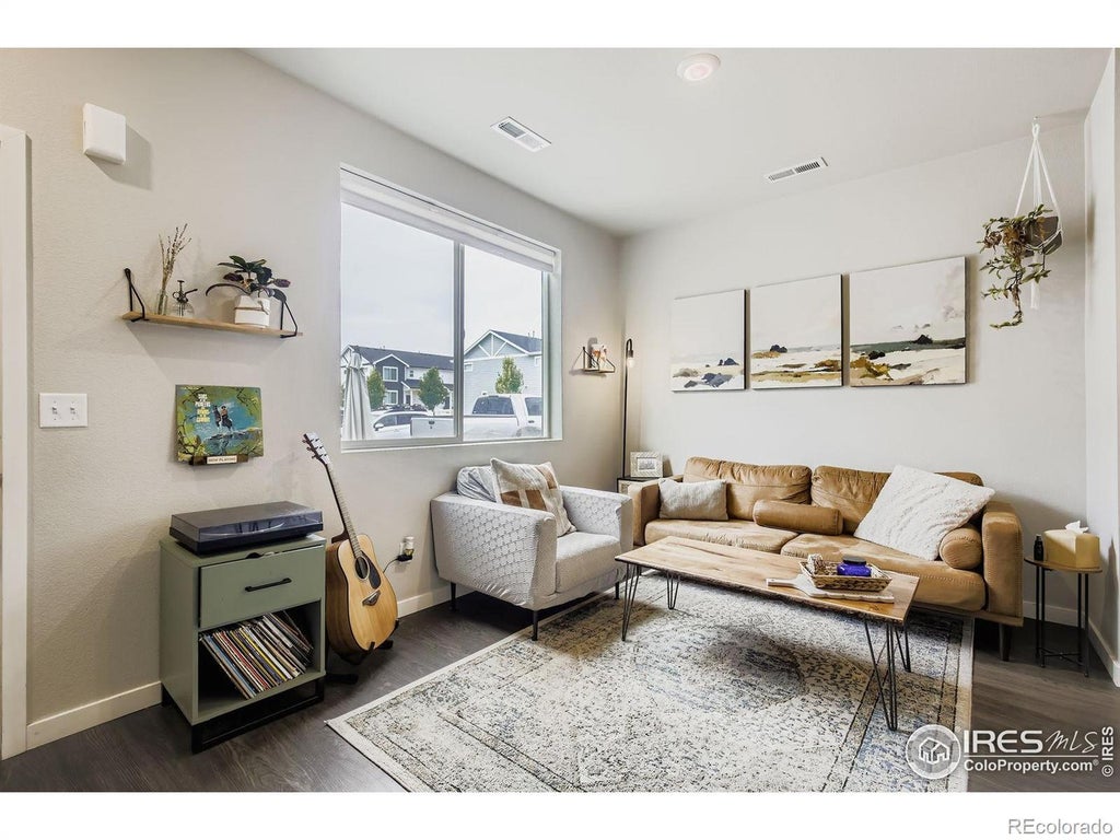 REDUCED PRICE!! LOW QTLY HOA. Nearly new! Modern, low-maintenance living, end unit townhome featuring a spacious 2-car garage, central A/C, and a private fenced courtyard, this home is perfect for those seeking comfort, convenience, and the Colorado lifestyle. With nearby parks, playgrounds, and mountain views, it's an ideal primary residence or lock-and-leave getaway. Step inside to soaring 9' ceilings on the main level, durable luxury vinyl plank flooring, and an open Great Room filled with natural light. The kitchen blends style and function with upgraded 42" cabinets, stainless steel appliances, ample storage, a central island, and a breakfast bar-perfect for entertaining or everyday meals. A convenient half bath completes the main level. Upstairs, both bedrooms feature their own bathrooms, providing privacy and flexibility for guests, roommates, or a home office. The primary suite includes a cozy ensuite bath, while the laundry area is just steps away for added ease. Enjoy evenings on your front porch, ideal for relaxing or hosting friends. With a high-efficiency furnace, thoughtful design, and low-maintenance exterior, this move-in ready townhome is ready to welcome its next owner.