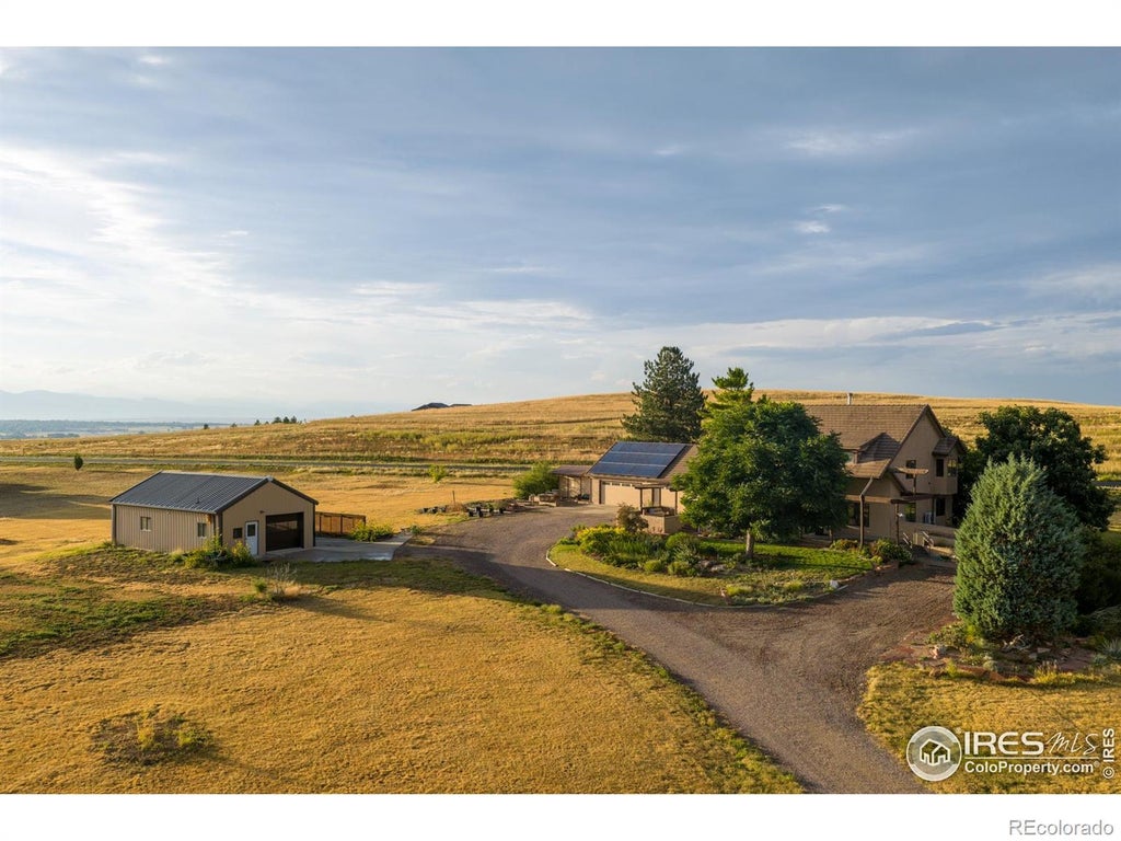 Welcome to this excellent custom home on 2 acres in coveted North Broomfield designed with efficiency, comfort, and style in mind with incredible mountain views. The 3,478 sqft main residence offers an updated kitchen with Jenn-Air oven & induction cooktop, warming drawer, built-in microwave, integrated dishwasher & refrigerator plus an extraordinary built-out pantry with sink that dreams are made of. Rich wood floors flow throughout the kitchen, dining area, and living room with a cozy wood-burning stove flanked by the gorgeous sunroom, perfect for year-round living. Tucked away on the main floor is a private office & half bath. Upstairs, the primary suite boasts a private balcony with sweeping mountain views, while two oversized bedrooms share a full bath. The fully finished basement includes a kitchenette, spacious living area with built-ins, large bedroom, spa-like bath and bright laundry room offering great storage.The property features thoughtful use of the southern exposure, owned solar panels, recently updated hot water heating system, forced air cooling and a low-maintenance tile roof all meant to maximize efficiency. Carefully curated, drought-tolerant landscaping offers drip & spray irrigation around the home, blending natural Colorado beauty with water-conscious design plus a large garden shed on the property. The 1150 sqft over-size deep 4-car garage plus incredible 800 sqft outbuilding with office and 3/4 bathroom, offer incredible versatility for your hobby or business needs. Conveniently located minutes from Broomfield amenities including Paul Derda Recreation Center & trails with incredible Colorado views and easy access to Denver, Boulder, and DIA, this home is the perfect blend of thoughtful design, efficiency, and opportunity.