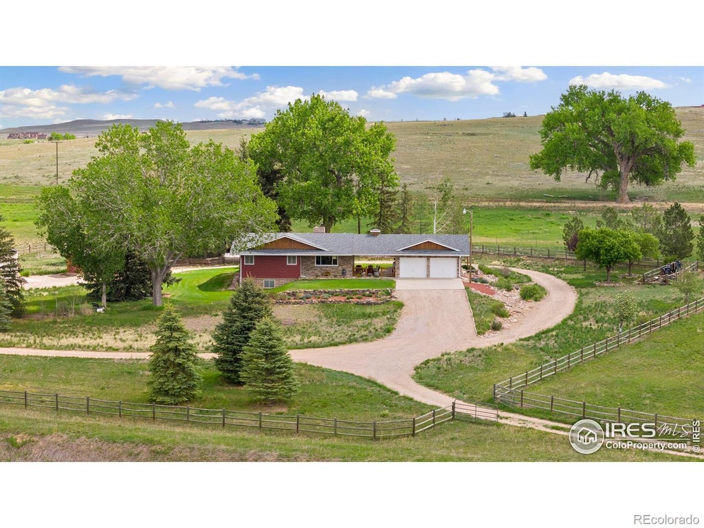 Presenting, for only its second time on the market, 5424 N CR 3. This is more than a home-it's a legacy property built for those who value nature, privacy, and a deep connection to the land. Encompassing 44+/- acres of pristine pastureland the property stretches nearly a mile from end to end with unending mountain views from every corner. The home is located at the end of a half-mile driveway that separates it from the 300-acre public Cobb Lake SWA which provides endless opportunities for hunting, dog training, hiking and wildlife viewing. The 3 bed 2 bath house was perfectly situated to showcase the stunning views of Longs Peak and the snowcapped ranges through every western window. Beautifully updated kitchen with Tharp custom knotty alder cabinets and striking live-edge wood accents. Incredible stone wraps a wood burning fireplace for cozy warmth in the winter. A 545 SF covered breezeway blends indoor and outdoor living with uninterrupted mountain views and connects the house to the oversized 2 car garage. This curated acreage is nestled between the Cowan Lateral and the Windsor Ditch with ditch roads that border the property providing nearly 2 miles of trails, perfect for horseback rides, exercising the dogs, or a morning stroll. No other property includes this diversity of habitat -- from hay pastures to cattail sloughs, fruit trees to mature stands of cultivated pines, and a seasonal pond create a truly unique offering. Equestrians will love the 2 Acre fenced pasture, round pen, loafing shed and potential for tack room and 2 stalls off the shop and plenty of room for future arenas. A 3-dog kennel run, homing pigeon loft, flight pens and proximity to the SWA make this a bird dog lover's paradise. A 965 SF detached shop includes insulated and heated workshop, tractor barn, and bird raising brooder house for game birds or poultry. See for yourself how this property truly embodies the endless opportunity of outdoor life in Northern Colorado.