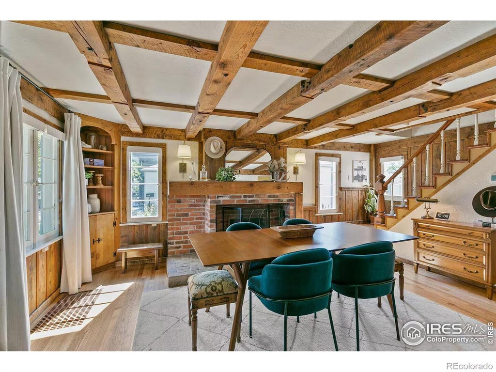 The Red House in Olde Town Arvada is a historic gem-perfectly situated just steps from the heart of the neighborhood, yet quietly tucked away on a peaceful street. With commuter rail access just three blocks south and Memorial Park only a block north, this location offers both vibrancy and tranquility. Inside, character and warmth unfold through original details and thoughtful updates. Sunlight pours through classic paned windows onto gleaming hardwood floors, while hand-hewn ceiling beams and a striking vintage fireplace anchor the dining room with undeniable charm. The living room opens through double doors to a newly designed private patio, creating seamless indoor-outdoor living. Upstairs, the generous primary bedroom gazes out at mature shade trees, while the updated bath impresses with a luxe rain shower. The kitchen and adjoining sunroom capture the home's cheerful spirit, and the large family room offers a welcoming space to gather. Outdoor living is enhanced with new sod, landscaping, and irrigation, a charming backyard retreat. A detached oversized one-car garage with an attached workshop adds versatility for projects or storage. You will love the finished shed with heat and AC, making an excellent home office or studio. With recent upgrades, including new A/C, updated plumbing, this residence blends historic character with modern ease. Generous basement space primed for your personal design and finishes.. Just moments from trails, parks, breweries, and boutiques, The Red House offers a rare lifestyle-vintage elegance paired with vibrant community energy, in Arvada's most sought-after neighborhoods.