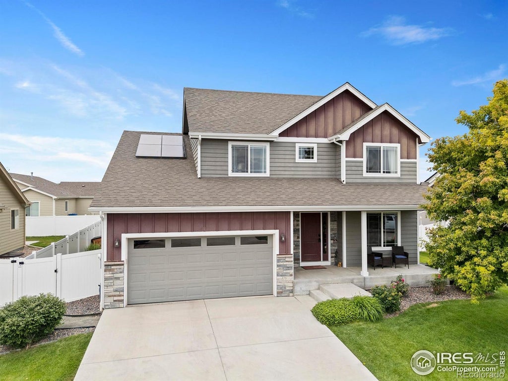 Welcome to this stunning 2-story, 3 bed, 4 bath Sage-built home in The Meadows. Nestled on a quiet street, this residence offers comfort, elegance, and modern upgrades throughout. Step inside through the keyless entry to find a bright main floor with beautiful wood floors throughout, featuring a powder bath, dedicated office, spacious living room with gas fireplace, and a gourmet kitchen with granite countertops, a large island, and stainless steel appliances. A separate dining room makes entertaining easy. The main floor primary suite includes a luxurious 5-piece bath and walk-in closet, with a convenient laundry room nearby. Upstairs, new carpet flows throughout, leading to a versatile loft and two light-filled bedrooms with a full bath. The unfinished basement with a complete 3/4 bath offers future expansion potential. Enjoy the beautifully landscaped front and back yards with perennial plants. The house features newer roof (2022), solar panels, an EV charger in the garage, and smart switches throughout the house with the lights changing color for modern living. With one of the largest floor plans in Wellington and a rare main-floor primary suite, this home is truly a standout.