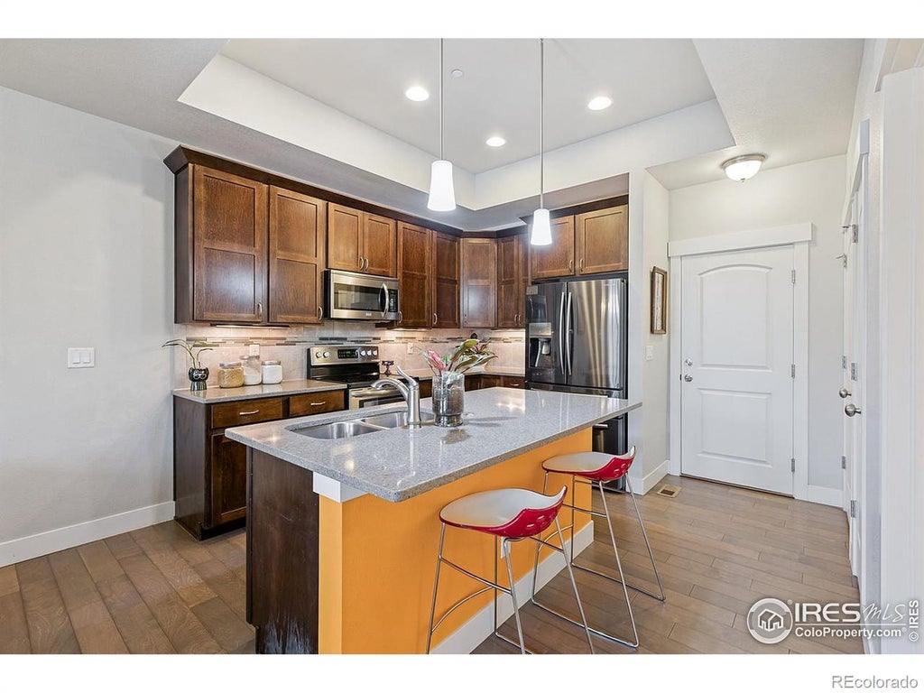 A wonderful, attached dwelling in the heart of it all, that offers both a functional layout paired with tasteful finishes throughout. This 2 bedroom, 3 bath home features dual ensuites, highlighted by tiled showers and granite countertops. Enjoy the convenience of a 2nd floor laundry room and an additional loft space suitable for a desk. The main level is canvased with engineered wood flooring, Maple cabinetry, stone countertops, and a functional gas fireplace. The unit faces south which allows for plenty of natural light. An attached 2 car garage and unfinished basement space round out the remainder of the amazing features. Easy access to I-25 and everything that central Fort Collins has to offer!